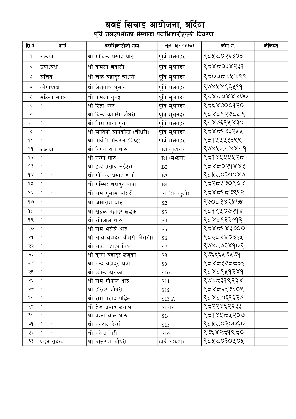 पूर्वी नहर जलउपभोक्ता संस्थाका पदाधिकारीहरु